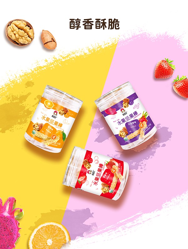 果蔬妃【水果堅(jiān)果棒】充分結(jié)合水果與堅(jiān)果的營養(yǎng)成分,融入花生、碧根果、芝麻、核桃的豐富口味,醇香酥脆,適合孕媽寶媽和3歲以上寶寶食用,有火龍果、草莓和香橙3種口味。