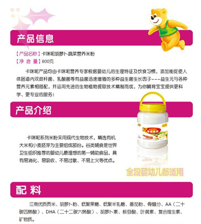 卡咪呢有機(jī)米粉系列是專為中國(guó)寶寶設(shè)計(jì)的營(yíng)養(yǎng)輔食,選用有機(jī)大米,科學(xué)搭配維生素AD等維生素,還特別添加牛磺酸、DHA、AA等有助智力發(fā)育的營(yíng)養(yǎng)成分,富含15種營(yíng)養(yǎng)素,F(xiàn)上?ㄟ淠啬笅胗闷酚邢薰久嫦蛉珖(guó)空白市場(chǎng)區(qū)域誠(chéng)招卡咪呢有機(jī)米粉代理商。