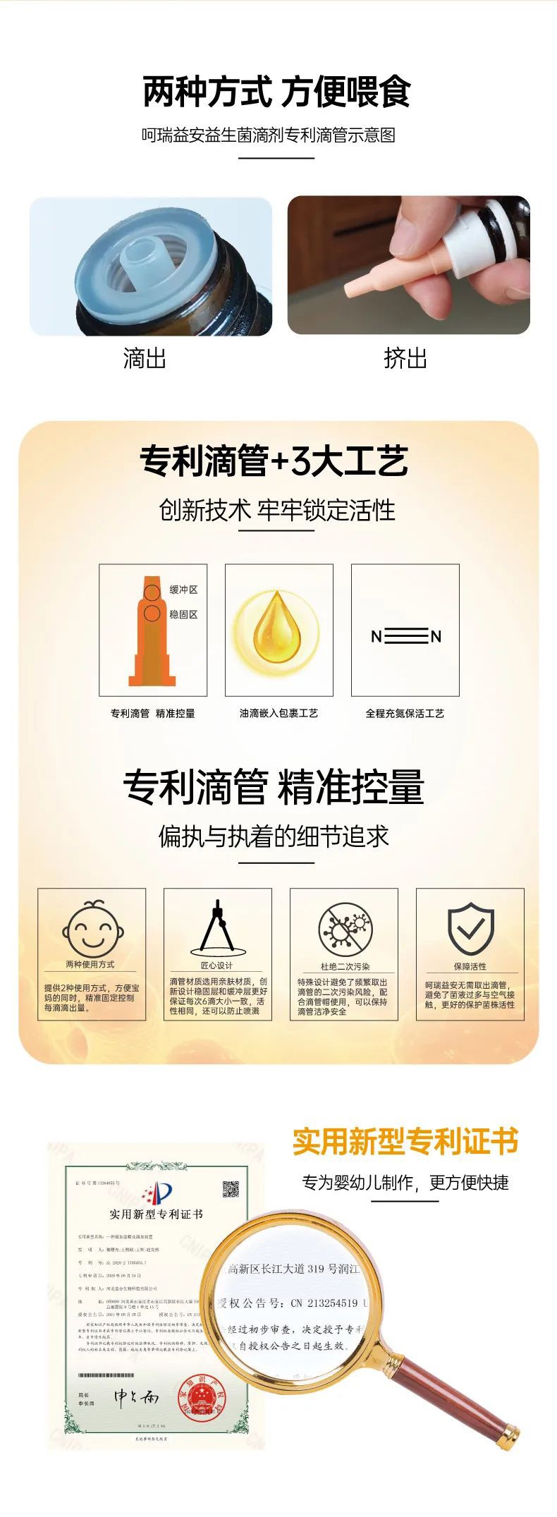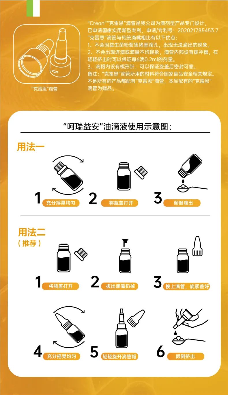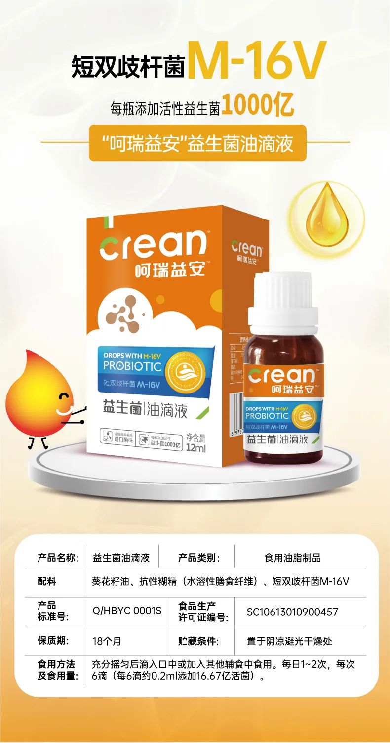 呵瑞益安短雙歧桿菌M-16V益生菌油滴液,采用進(jìn)口菌株,且選用菌株符合衛(wèi)健委【可用于嬰幼兒食品的菌種名單】。添加進(jìn)口原料,如瑞典AAK進(jìn)口油脂及進(jìn)口水溶性膳食纖維,安全配方,自主研發(fā)生產(chǎn),每瓶添加1000億活性益生菌,專利滴管,精準(zhǔn)控量,油滴嵌入包裹工藝+全程充氮;罟に嚕卫捂i定活性。
