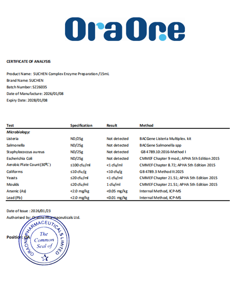 產(chǎn)品為新西蘭原裝進口,生產(chǎn)商奧拉具備新西蘭藥廠級生產(chǎn)資質(zhì),并通過HACCP、GMP、FDA等國際權(quán)威體系認證,生產(chǎn)環(huán)境與質(zhì)控體系達到藥品級標(biāo)準(zhǔn),該復(fù)配酶制劑類產(chǎn)品適用于新西蘭食品及膳食補充劑的生產(chǎn)和加工。