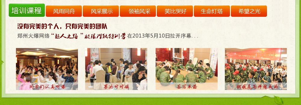 - 鄭州火爆網(wǎng)絡(luò)2013年“超人之路,潛能的極限訓(xùn)練”總結(jié) 在這些活動(dòng)中,我不再抱著無所謂的心態(tài),而是盡全力,全身心的投入進(jìn)去,果然當(dāng)我的一顆心真正投入到這個(gè)活動(dòng)中的時(shí)候,我感覺自己又回到...