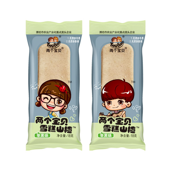 兩個(gè)寶貝山楂制品以山楂為主要原料,添加白砂糖、生活飲用水等為輔料和食品添加劑胭脂紅等,經(jīng)原料挑選、清洗、蒸煮、配料、打漿、攪拌、刮片、烘烤、揭片、切片(條或粉碎、揉球)、烘烤、包裝等工藝制成的。