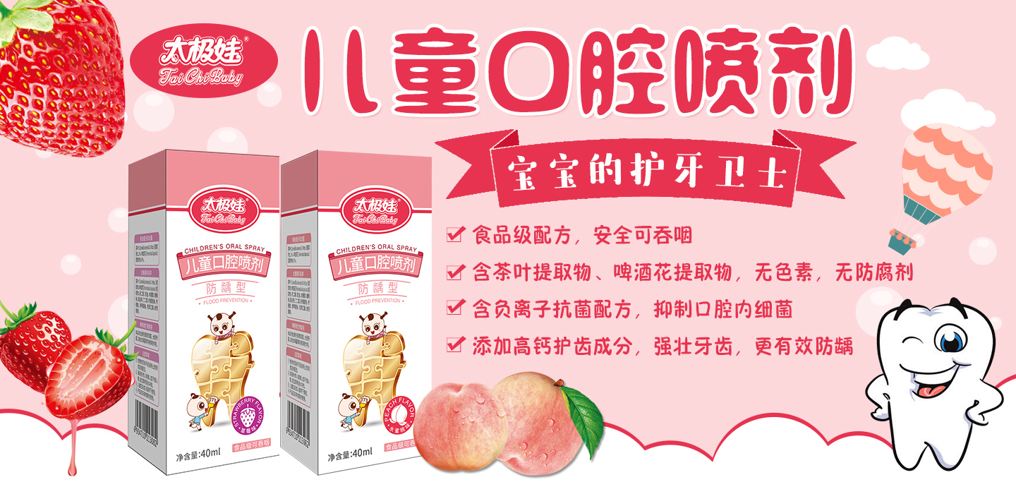 寶寶齲齒,媽媽煩惱,怎么辦?太極娃兒童口腔噴劑,食品級(jí)配方,安全可吞咽,含茶葉提取物、啤酒花提取物,無(wú)色素、無(wú)防腐劑,含負(fù)離子抗菌配方,添加高鈣護(hù)齒成分,強(qiáng)壯牙齒,更有效防齲