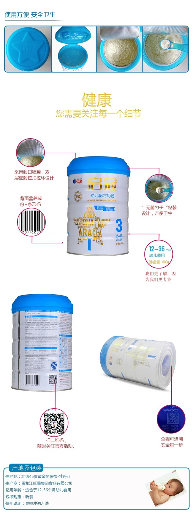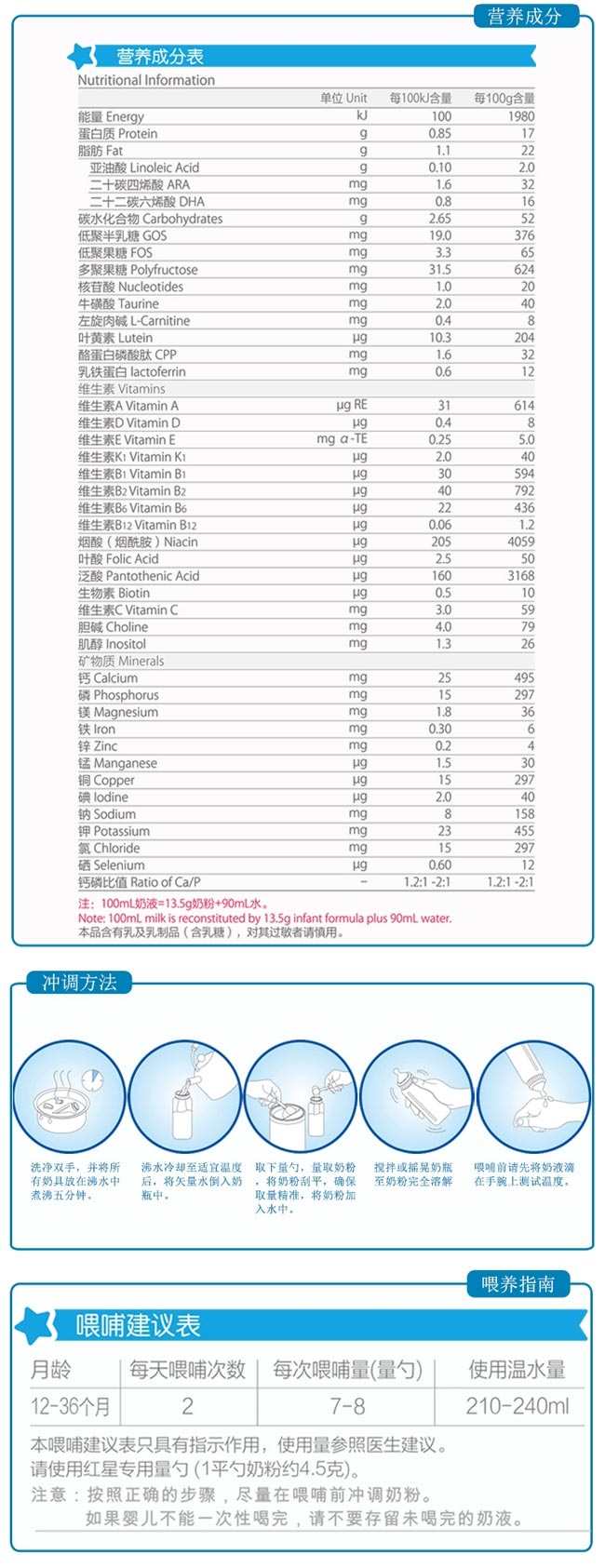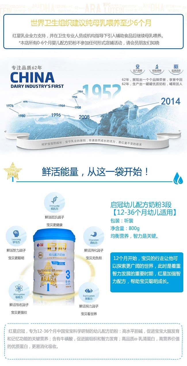 均衡營養(yǎng),免疫是關(guān)鍵。 12個月開始,寶貝的行走讓他可以探索更廣闊的世界,此時是著重智力發(fā)展的重要時期,紅星加強智力配方,幫助寶貝聰明成長。 紅星啟冠,專為12-36個月中國寶寶科學研制的幼兒配方奶粉: 高水平膽堿,促進寶寶大腦發(fā)育和記憶功能的關(guān)鍵營養(yǎng); 含有牛磺酸,促進腦組織和智力發(fā)育; 高品質(zhì)α-乳清蛋白,高營養(yǎng)價值的優(yōu)質(zhì)蛋白,更易消化吸收。 |