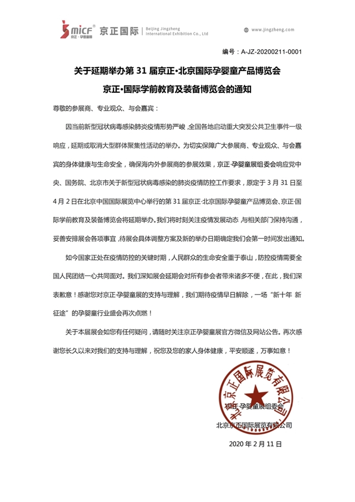 關(guān)于延期舉辦第31屆京正北京國(guó)際孕嬰童博覽會(huì)京正國(guó)際學(xué)前教育及裝備博覽會(huì)的通知。